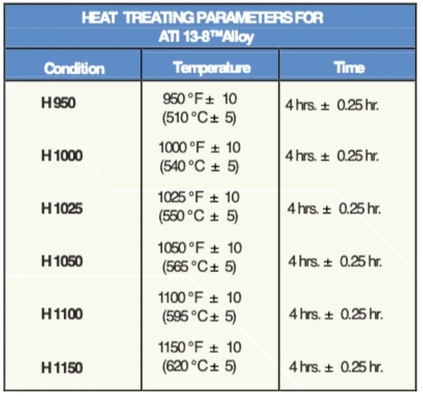 13-8 Precipitation Hardening Alloy is produced in the annealed condition. This is also called the solution heat treated condition, or Condition A. Solution treat from 1675 to 1725°F (910 to 940°C) for 15 to 30 minutes at temperature. Air cool or oil quench to below 60°F (15°C) to effect complete transformation to martensite. Aging is normally carried out from 950 to 1150°F(510 to 620°C), depending upon the desired final properties. Heat treatment is usually performed